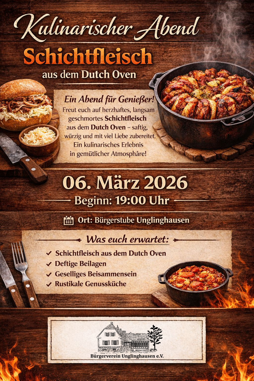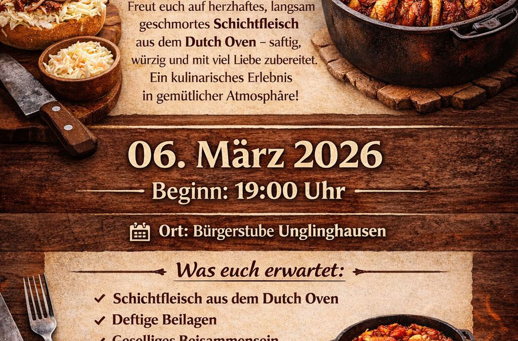 Für die nächste Ausgabe von “Bürgerstube kulinarisch” haben wir nach der leckeren Linsensuppe, eine wahre Köstlichkeit im Angebot. Es wurden keine Kosten und Mühen gespart, um leckeres Schichtfleisch aus dem Dutch Oven anzubieten.