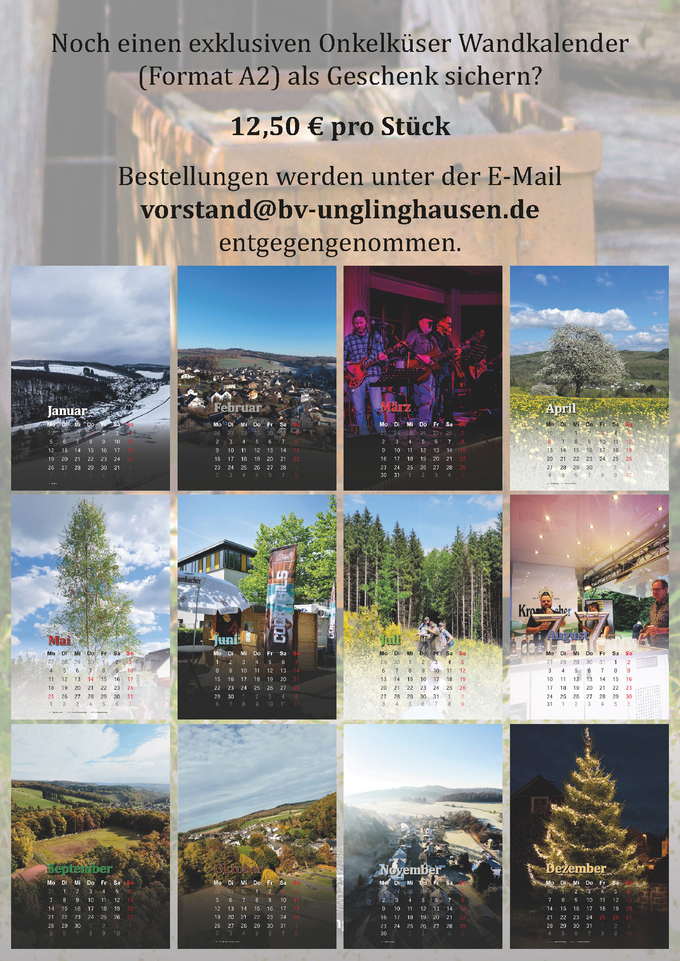 Der Onkelküser Jahreskalender ist in exklusiver Auflage ab sofort erhältlich. Noch auf der Suche nach einem Geschenk für Weihnachten? 12 Monate - 12 Impressionen von Unglinghausen im Format A2.