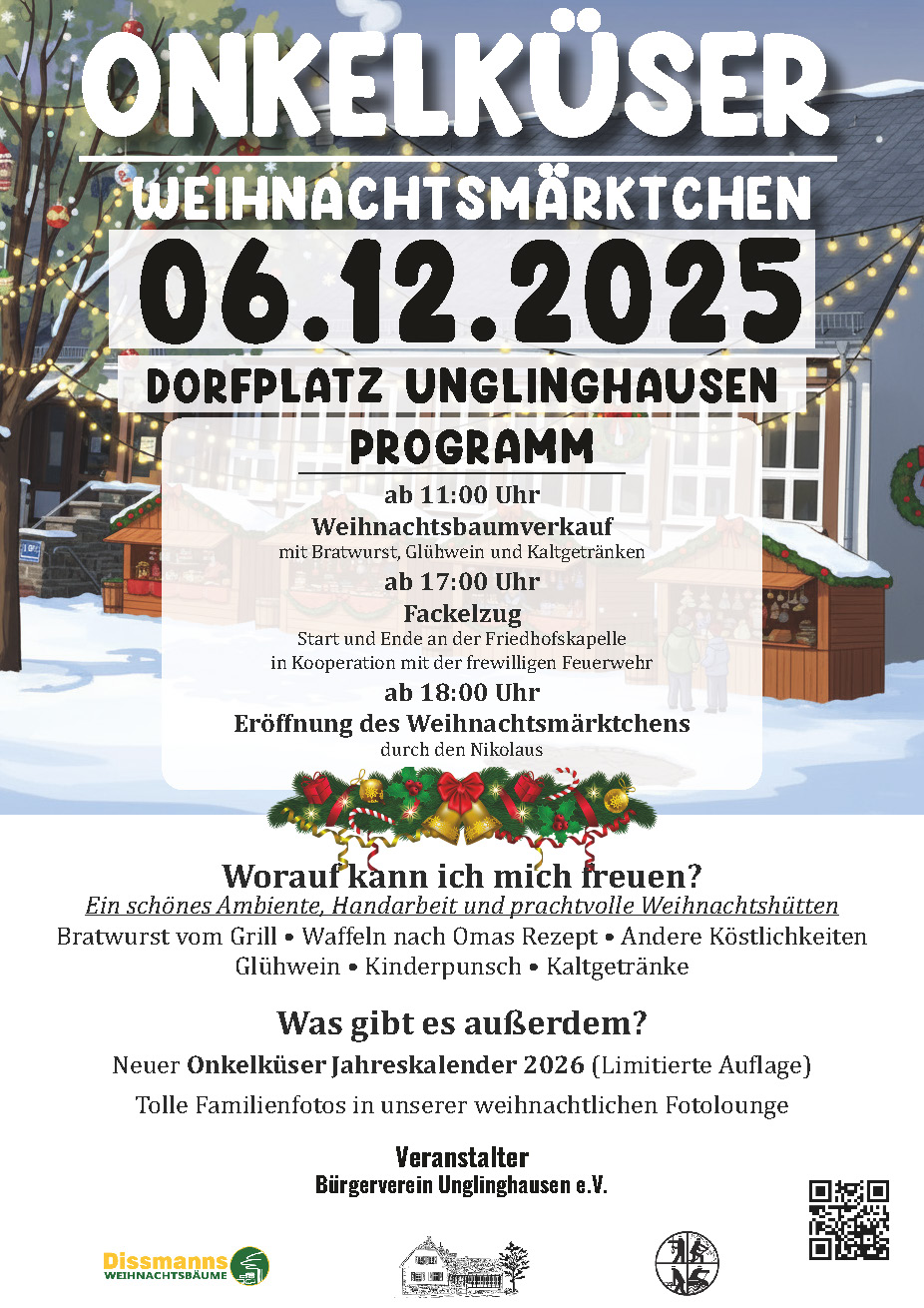 Am 6. Dezember 2025 lädt der Bürgerverein Unglinghausen e.V. alle herzlich zum Onkelküser Weihnachtsmärktchen auf dem Dorfplatz Unglinghausen ein. Erleben Sie ein festliches Ambiente mit liebevoll gestalteten Weihnachtshütten, Handwerkskunst und kulinarischen Köstlichkeiten.